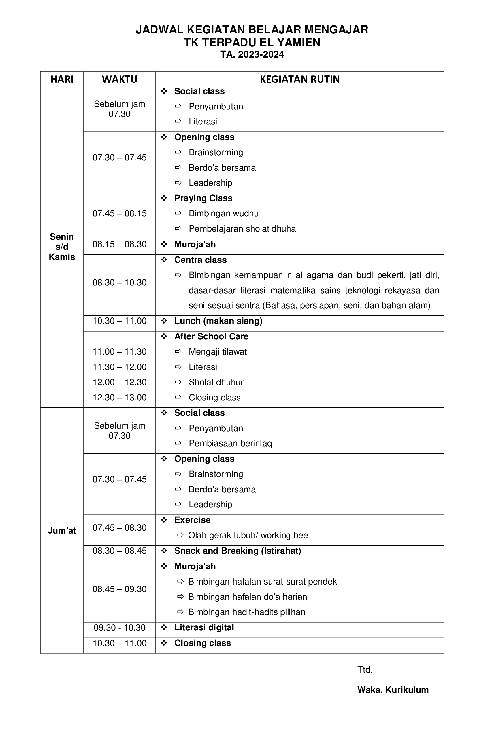 Jadwal Pembelajaran merupakan jadwal yang berisi kegiatan anak didik mulai hari senin sampai jum'at.